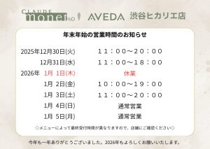 【クロード・モネH2Oアヴェダ渋谷ヒカリエ店】年末年始営業のお知らせ