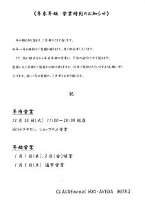 【クロード・モネH2OアヴェダTOKIA店】年末年始営業のお知らせ